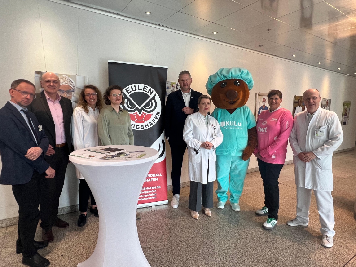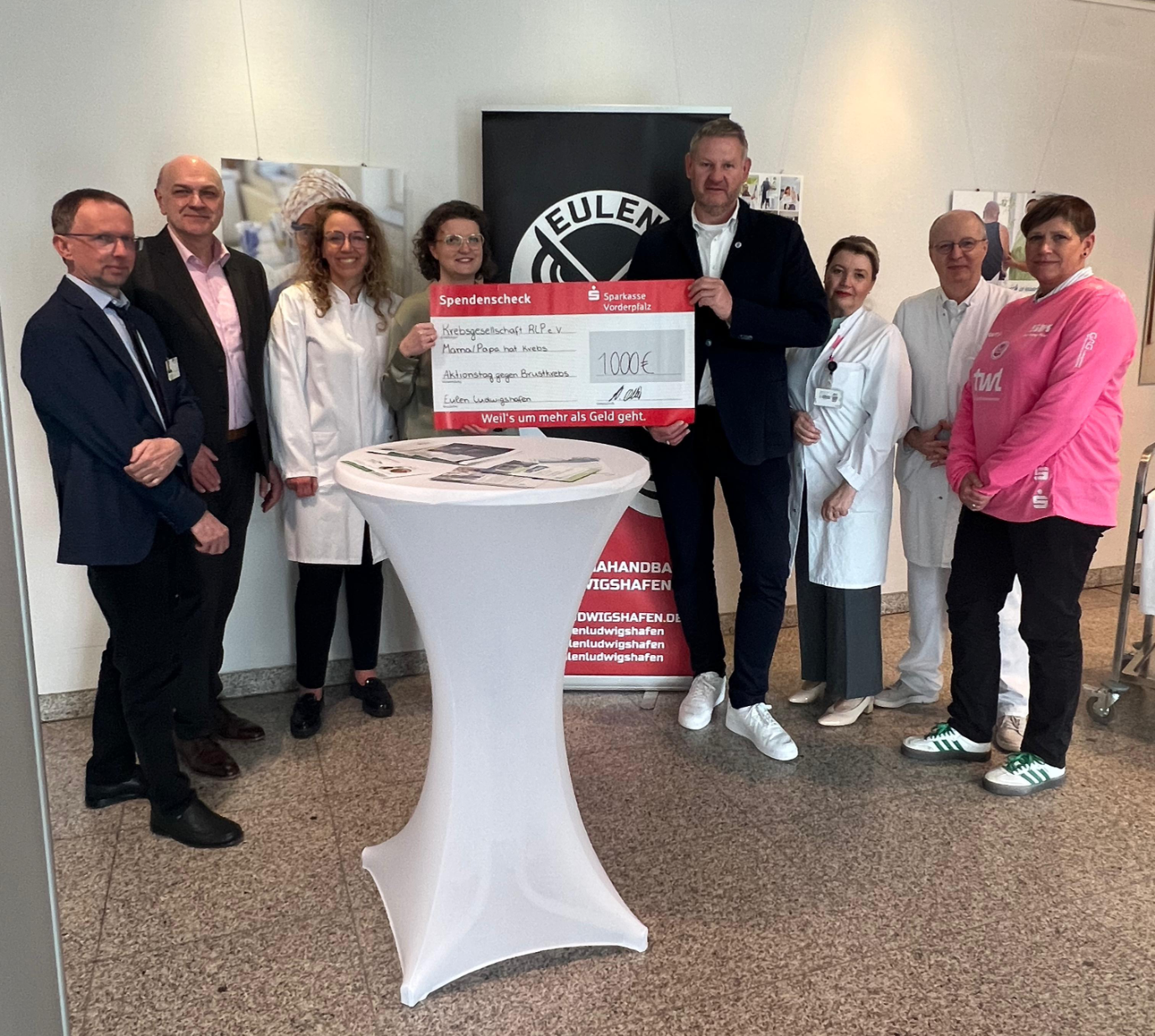 Spendenübergabe im Klinikum Ludwigshafen: Beim Weltbrustkrebstag am 1. Oktober 2025 hatten die Eulen Ludwigshafen den Aktionstag im Klinikum aktiv unterstützt und pinkfarbene Trikots verkauft. Den Erlös von 977 Euro aus dem Trikotverkauf rundeten die Eulen auf 1000 Euro auf. Der Spendenscheck wurde am Mittwoch an das Familienprojekt „Mama/Papa hat Krebs“, einem Herzensprojekt der Krebsgesellschaft Rheinland-Pfalz, übergeben. „Wir unterstützen und begleiten Familien, wenn ein Elternteil an Krebs erkrankt ist. Wir stärken die Familien in dem wir mit ihnen die Freizeit planen und mit ihnen in Familienfreizeiten fahren. Wir unterstützen sie so dabei, den Krankheitsweg besser verarbeiten zu können“, erläutert Katja Hubrich, die „Mama/Papa hat Krebs“ in Ludwigshafen leitet.