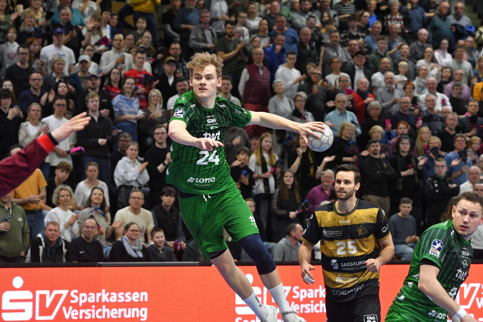Vincent Bülow (3 von 3) macht die „verdiente Niederlage“ an Kleinigkeiten fest. „Bitter, wir hatten eine gewisse Chance“, hadert der Spielmacher. Sein Blick ist schon auf den nächsten Freitag (20 Uhr) und auf das Spiel gegen Lübeck gerichtet: „Jetzt müssen wir die 2 Punkte holen!“ 12 Paraden hatte Žiga Urbič, zwei steuerte Philipp Wenning in den letzten neun Minuten bei. So wurde addiert das Torhüter-Duell 14:11 gewonnen. „Eine bittere Niederlage. Ich dachte, wir können was mitnehmen“, sagte Žiga Urbič und rätselte: „Vielleicht fehlen uns am Ende Momo und Friedrich.“ Friedrich – das ist Torjäger Schmitt. Momo – das ist ein Abwehr-Bollwerk.