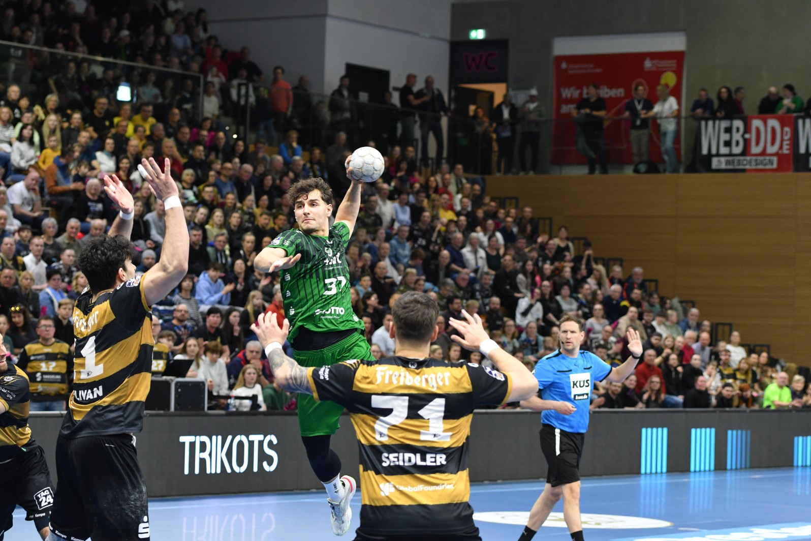 Unabhängig ob 1. oder 2. Bundesliga – die Dresdner stellen die Weichen für die Zukunft. Überraschend, dass der Vertrag mit dem türkischen Nationalspieler Doruk Pehlivan nicht verlängert wird. Dafür kommt im Sommer der frühere Eulen-Profi Julius Meyer-Siebert aus Ferndorf. Den umgekehrten Weg geht Kreisläufer Timo Stoyke. Aber Pehlivan spielt herausragende 60 Minuten, macht 4 von 7, am Ende sind es 9 von 15 für die ambitionierten Sachsen. Den Torreigen eröffnet Theo Straub, der bei den Eulen auf Rechtsaußen startet. Nach 86 Sekunden aber quittiert René Zobel, erneut rekordverdächtig, nach Foul am starken Anton Preußner, die erste Zeitstrafe der Partie. Bis zur 16. Minute - Zobel hämmert das 7:7 ins Netz - bleiben die Eulen auf Augenhöhe. Lauro Pichiri und Lukas Wucherpfennig sorgen für die erste Zwei-Tore-Führung der Gastgeber (9:7 nach 19 Minuten). Nach Norbergs 14:10 in Minute 27 ist es nicht gut um die Eulen bestellt, doch Žiga Urbič hält sie mit seiner neunten Parade in den ersten 30 Minuten im Spiel. Die Parade veredelt Tim Schaller mit einem erfolgreichen Gegenstoß (14:11 in der 28. Minute). Sekunden der Pause, Eulen-Trainer Michael Haaß setzt in den letzten 30 Sekunden vor dem Halbzeitpfiff auf den 7. Feldspieler, trifft Freddy Stüber nach Zobels Pfostenschuss: 14:12. Kapitän Stüber, 4 von 4, zeigt seine Klasse. Stark im Tor der Dresdner: Mario Mallwitz mit 8 Paraden.