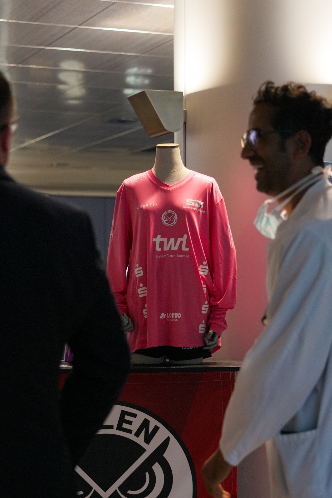Im Foyer des Klinikums verkauften die Eulen Charity-Trikots für 50 Euro. Die Trikots sind pinkfarben, weil Pink die Farbe gegen Brustkrebs ist. Pro verkauftem Shirt werden 10 Euro für das Projekt „Mama/Papa hat Krebs“ der Krebsgesellschaft Rheinland-Pfalz gespendet.