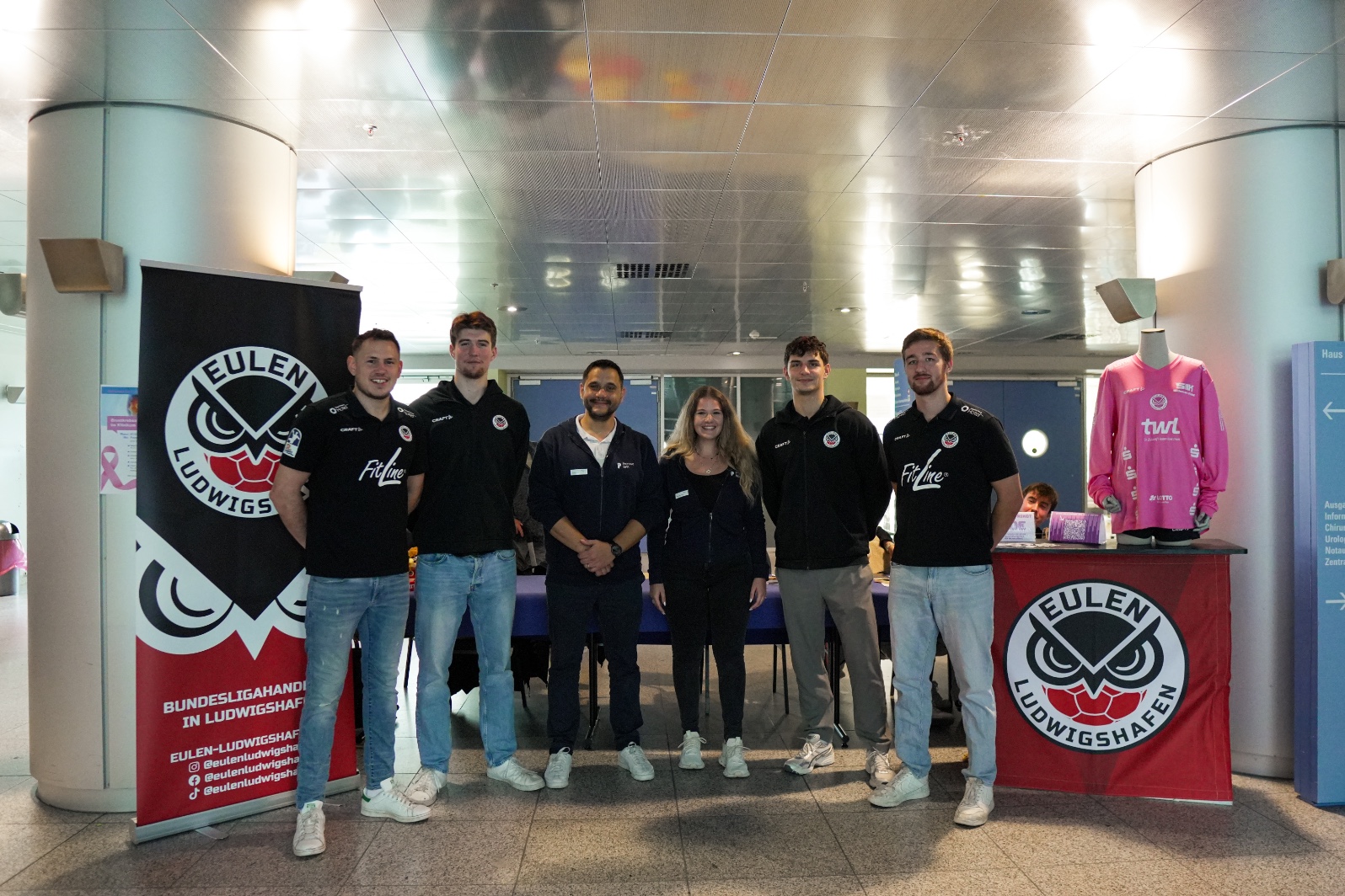 Die Eulen Ludwigshafen unterstützten das Ludwigshafener Klinikum am Mittwoch, 1. Oktober, bei einem Aktionstag gegen Brustkrebs. Weltweit ist der Oktober der Aktionsmonat gegen Brustkrebs, bei dem für die Krankheit sensibilisiert werden und zu Vorsorgeuntersuchungen ermutigt werden soll. Dr. Klaus Baumann, der Chefarzt der Frauenklinik, freute sich über einen erfolgreichen Aktionstag. „Wir sind ganz begeistert über diese gemeinsame Veranstaltung mit den Eulen. Im Brustkrebs- Monat Oktober ist das ein schönes und wichtiges Bewusstmachen der Thematik. Und was haben Handball und Medizin und Vorsorge gemeinsam? Es geht um das Gewinnen! Auch wenn die Eulen nicht immer gewinnen können und auch wenn man beim Brustkrebs nicht immer gewinnt, bringt die Vorsorge die große Chance für die Frauen, die Gewinnerin zu sein, in dem man eine Erkrankung möglichst früh erkennt und damit einfach bei bester Prognose behandeln kann. In dem Sinne ist das heute eine sehr wertvolle Veranstaltung“, bilanzierte Dr. Baumann. „Wir freuen uns in der Kooperation mit dem Klinikum solche Aktion unterstützen zu können“, sagte Eulen-Geschäftsführer Domenico Marinese und zeigte sich hoch zufrieden mit dem Ablauf.