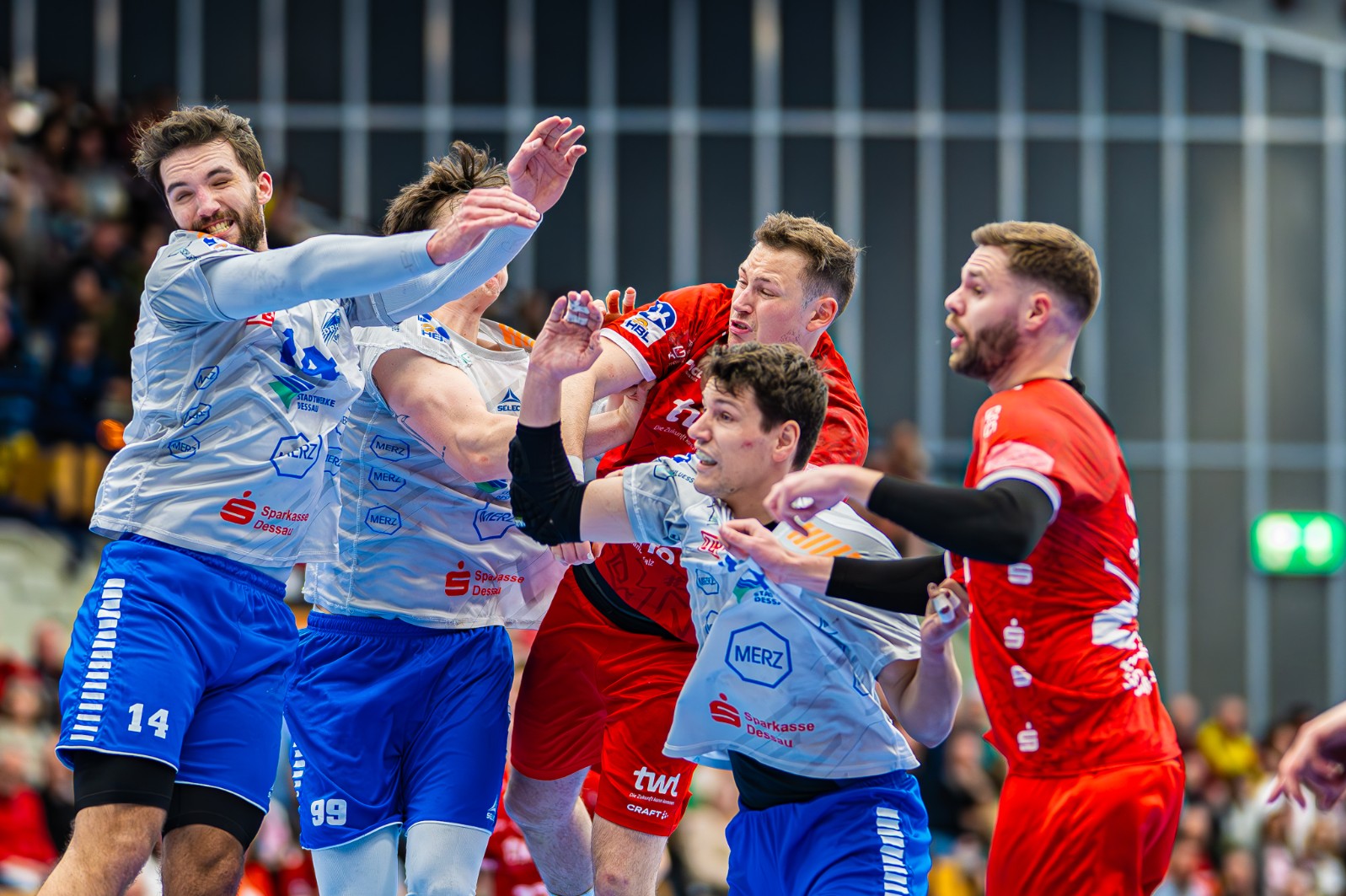 „Wir haben im Angriff zu viel verballert“, haderte Alex Falk nach dem Desaster. Dessaus Kapitän Vincent Bülow, ab 1. Juli bei den Eulen unter Vertrag, spielte quasi gegen seine Zukunft. Den Zwiespalt blendete der 29-jährige Musterprofi komplett aus, beeindruckte auf schnellen Beinen mit einer Top-Vorstellung. „Ich konnte keine Rücksicht nehmen, ich musste so spielen“, betonte der Mann mit der Nummer 10. „Vince“ Bülow: „Es war ein Kampfspiel in dem wir auch ein bisschen mehr Glück hatten.“ „Die Eulen sind wie die Feuerwehr gestartet, wir machen in den ersten zehn Minuten sechs technische Fehler“, konstatierte Dessaus Trainer-Fuchs Uwe Jungandreas, der seine Mannschaft aber mit klarer Ansage in der ersten Auszeit auf Kurs brachte. „Wir haben verdient gewonnen“, sagte Jungandreas, der Dessau als Zweitligist übergeben möchte, wenn er sich im Sommer nach elf ereignisreichen Jahren in Richtung Aue verabschiedet. Er war „sehr zufrieden“ mit dem so wichtigen Auswärtssieg und sieht der noch nicht gebannten Abstiegsgefahr ins Auge: „Wir sind eine der acht, neun Mannschaften, die noch nicht wissen,wie es ausgeht …“