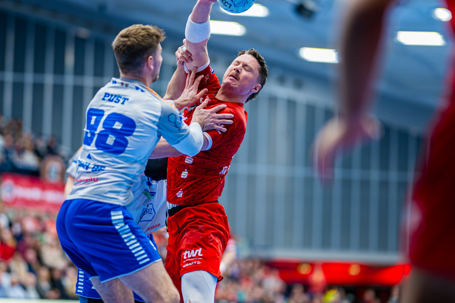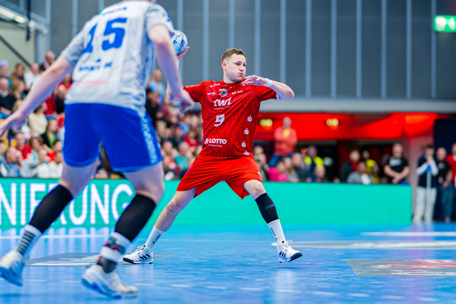 Enttäuscht, ja fassungslos, komplett ratlos, stellte sich der engagierte Linksaußen Kian Schwarzer top professionell kurz nach Spielende den Fragen von Journalisten. „Wir verteidigen über weiter Strecken wieder gut. Die Chancenauswertung war dann aber nicht gut“, sagte Schwarzer, der seine Farben unmittelbar nach der Pause „in doppelter Unterzahl“ ins Verderben stolpern sah. „Wir sind dann ja nochmal auf ein Tor rangekommen, sind in Überzahl …“, haderte der stets hoch motivierte Linksaußen, der sich und die Fans pushte, als die Wende nochmals möglich schien. Wie geht er mit dem Druck, den die Tabellenlage mit sich bringt, um? „Ich versuche das im Spiel auszublenden. Ich versuche mein Bestes zu geben“, erklärte Kian Schwarzer, der vor allem von Mex Raguse (3 von 5) gut angespielt wurde. Die Rechtsaußen, erst Alex Falk, der ohne jeglichen Abschluss blieb, dann Theo Straub, dagegen litten Not. Sie bekamen kaum einen Ball! Ein Manko, das zur Niederlage ebenso beitrug wie das nur anfangs gute Kreisspiel. Freddy Stüber (3 von 3) war gut gestartet, dann fehlte ihm das Futter. Das sah auf der Gegenseite besser aus. Tillmann Leu (4 von 4) und Tim Hertzfeld (3 von 4) wurden gut bedient. Auch da hatte der überragende Spielmacher „Vince“ Bülow eine Aktie.