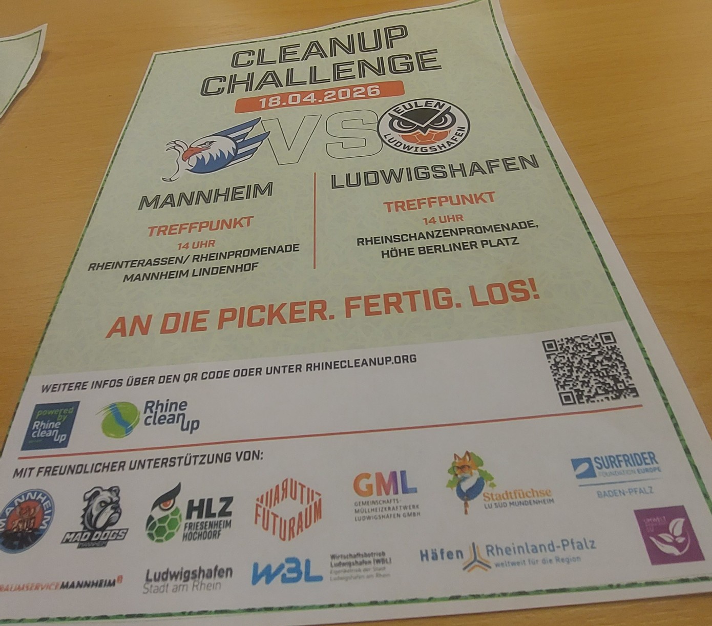 Uwe Franken ist dankbar dafür, dass sich die Adler Mannheim und die Eulen Ludwigshafen - wie schon 2024 und 2025 - aktiv mit ihren Profis für das Rhein Cleanup engagieren. Sie haben Vorbildcharakter und motivieren zum Mitmachen, betont Franken. Mehr als 800 Kilogramm Müll wurden sowohl 2024 als auch 2025 in den zwei Stunden zusammen gerechnet auf Mannheimer und Ludwigshafener Seite gesammelt. Gewinner der Challenge ist die Stadt, die die meisten Müllsammler aktiviert. Das war 2024 Ludwigshafen, 2025 Mannheim. Insgesamt waren im letzten Jahr mehr als 300 Müllsammler zugange. „Je mehr Präsenz, umso besser. Ich bin begeistert, wie viel Ehrgeiz die Städte entwickelt haben“, sagte Franken. In Mannheim wird die Challenge am 18. April, 14 Uhr, an den Rheinterrassen/Rheinpromenade im Lindenhof gestartet, in Ludwigshafen geht‘s zeitgleich an der Rheinschanzenpromenade (Gelbes Haus) los. Die abschließende After-Clean-Party steigt am Gelben Haus in Ludwigshafen und wird von den Hafenbetrieben Rheinland-Pfalz finanziert.