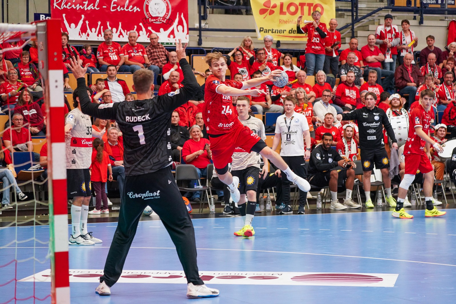 Das Hinspiel hat TuSEM mit Max Neuhaus, dem von den Eulen-Fans so geliebten Traktor, 26:24 gewonnen. „Da haben wir aber nicht wirklich schlecht gespielt“, relativiert Rechtsaußen Theo Straub. Der Hochbegabte bekommt Entlastung; denn Alex Falk ist wieder fit und bereichert auch auf halbrechts die taktischen Möglichkeiten des Trainers. Nach dem verletzungsbedingten Ausfall von Axel Schoss, einem starken Linkshänder, rechnet Eulen-Coach Johannes Wohlrab mit einem ausschließlich mit Rechtshändern besetzten Rückraum von TuSEM. Unabhängig von der 6:0-Abwehr der Essener, die um zwei Außen wissen, die sich gerne Steals nehmen, baut Wohlrab auf die auch beim 33:34 in Coburg verbesserte Offensive seiner Mannschaft: „Die Angriffsleistung von Coburg war ein großer Fortschritt. In der Konstellation wird es auf die Abwehr ankommen. Wir müssen Beton anrühren!“