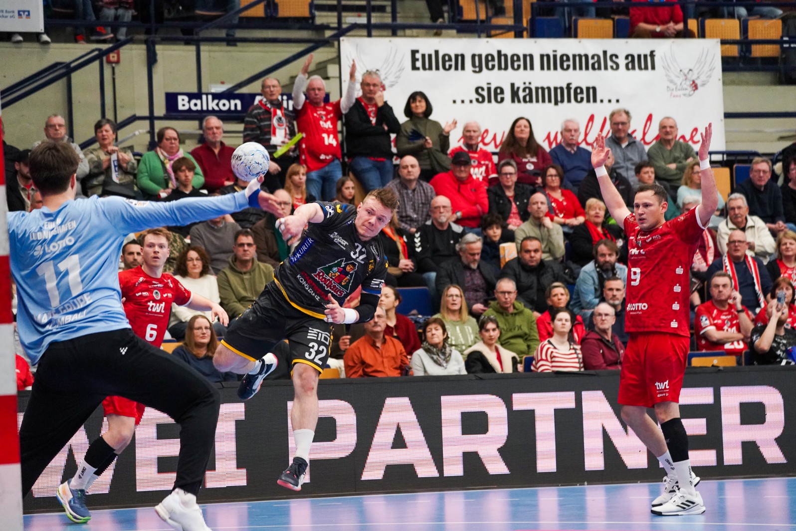 Marc-Robin Eisel, der seinen Vertrag bis 30. Juni 2026 verlängert hat, ist eine Triebfeder der Aufholjagd. Eisel kämpft. Eisel rackert. Eisel hat Ballgewinne. Und er trifft: 6 von 13. Er schafft es Freddy Stüber am Kreis - aus Eulen-Sicht allerdings zu spät - in Szene zu setzen. Genial in der 39. Minute das Rückhandzuspiel Eisels, das Stüber zum 15:18 nutzt. 4 von 4 verbucht der Kreisläufer! Eisel wäre der Held des Abends gewesen, hätte er eine Minute vor Schluss das 28:26 erzielt. Konstantin Poltrum aber hält – seine zwölfte Parade. Alexander Leindl nutzt die nächste Chance auf der Gegenseite: 27:27. 33 Sekunden bleiben. Den letzten Wurf nimmt sich Alex Falk – und scheitert. „Es war einfach ein ganz schlechtes Spiel“, gesteht der Rechtsaußen (3 von 5). Nach einem Solo von Sebastian Trost (4 von 9) und einem Pass von Tim Schaller begeistert Falk mit einem perfekten Kempa zum 19:22. Sie können’s doch! Eigentlich … „Es sollte nicht sein. Ich glaub‘ ich hab‘ viermal die Latte getroffen“, hadert Eisel, der verhinderte Held.