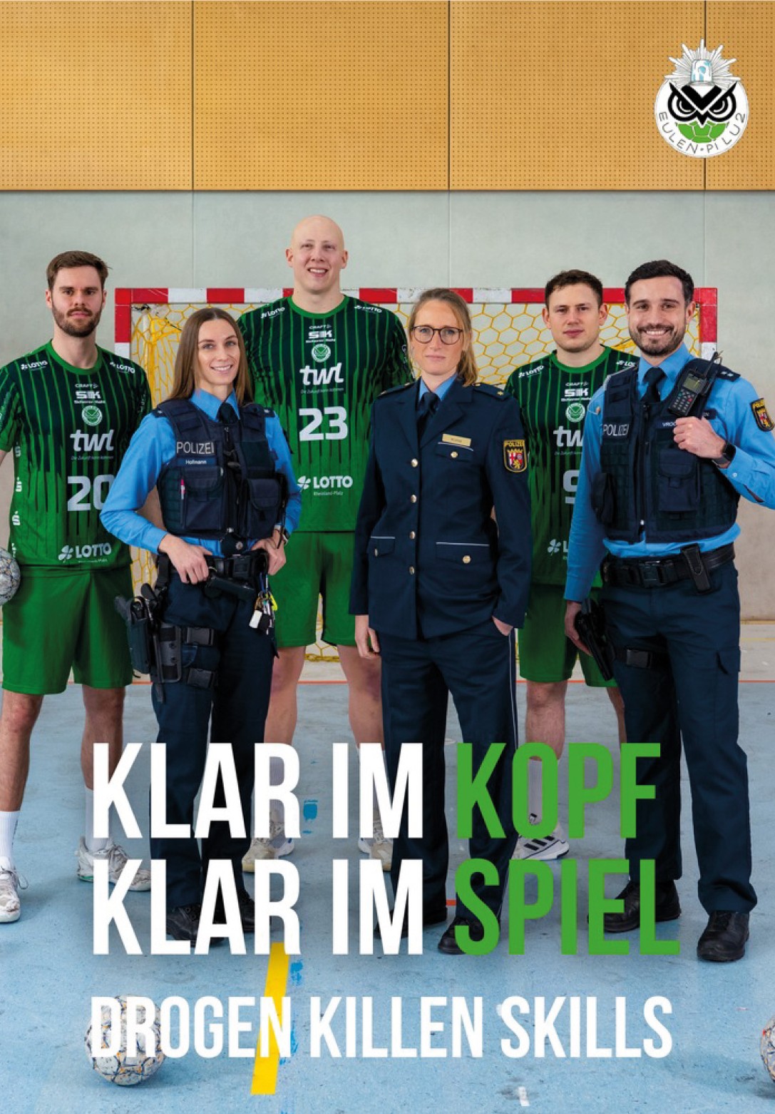 „Die Polizei ist ein verlässlicher Partner. Den Austausch empfinde ich als wahnsinnig konstruktiv. Es macht immer wieder Spaß, sich zusammenzusetzen und Themen zu erarbeiten“, würdigt Eulen-Geschäftsführer Marinese das konstruktive-freundliche Miteinander. „So haben wir auch schnell Einigung über die neue Kampagne erzielt“, sagt Domenico Marinese, der um den Wert der Besuche von Profis in Schulen weiß. Lars Röller, einer der drei Kreisläufer der Eulen, berichtet: „Ich war mit Robin Eisel bei einem Schulbesuch mit der Polizei dabei. Wir konnten ein paar Minuten über die Gefahren von Drogen sprechen und deutlich machen, dass es für Leistungssportler unmöglich ist, was einzuwerfen. Unabhängig davon, dass bei Spielen auch immer wieder Dopingtests durchgeführt werden, haben wir den Kindern gesagt, wie gefährlich Drogen sind. Das Thema gemeinsam mit der Polizei zu transportieren ist wichtig. Vielleicht können wir als Sportler da auch Vorbild sein.“