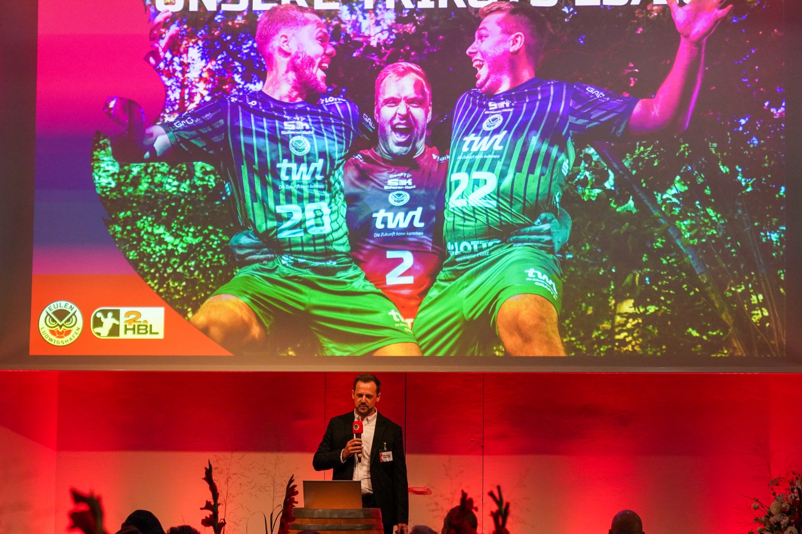 Domenico Marinese erklärte auch den neuen Slogan „Aus de Palz, fer die Palz“. „Wir müssen größer denken! Wir sind nicht nur der Handball-Klub der Stadt, sondern auch der Region“, unterstrich der Geschäftsführer die Rolle der Eulen als hochklassigste Männermannschaft im rheinland-pfälzischen Männerhandball. „Uns macht der Dialekt aus“, betonte Marinese. Das Thema werde sich widerspiegeln, ergänzte er auch mit Blick auf den neuen Einlauf-Trailer und das grüne Auswärtstrikot – die Eule im Wald …