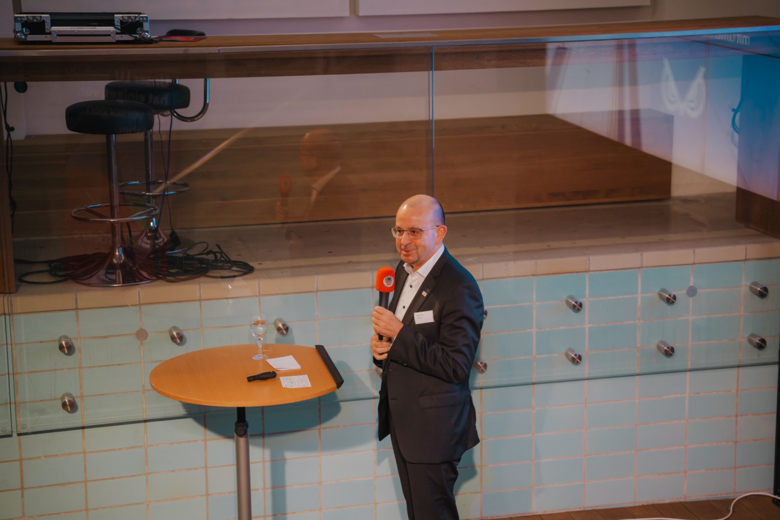 Die Partner, die Domenico Marinese noch nicht kannten, hatten dann die Gelegenheit ihn und das neue Team der Geschäftsstelle besser kennen zu lernen. Domenico gab einen Einblick in seinen bisherigen Lebenslauf und stellte sein neues Team vor. Bei seiner ersten Veranstaltung als Geschäftsführer nahm er die Partner mit durch seine bisherigen beruflichen Stationen in der SAP Arena, als Pressesprecher beim SV Waldhof Mannheim und zuletzt bei der Bilfinger SE, gab aber auch kleine Einblicke in sein Privatleben und erzählte, dass sein Sohn abends gerne mit dem Papa Gummibärchen essen möchte…
