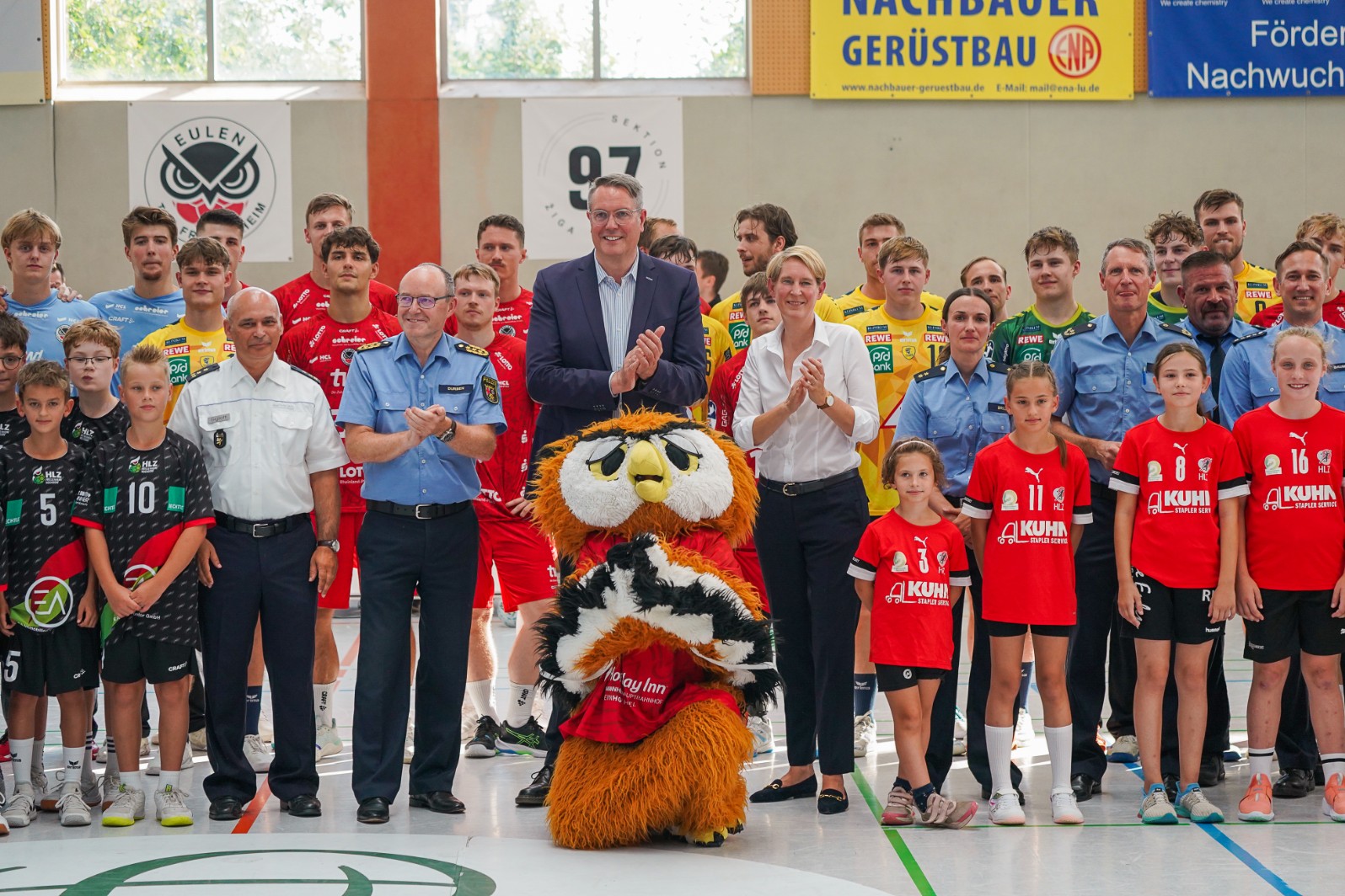 Gut gelaunt bei seinem ersten Besuch als Ministerpräsident in Ludwigshafen zeigte sich Alexander Schweitzer. Dass er mit seinen 2,06 Metern zum Rückraumspieler tauge, verwies der 50-Jährige aber lachend ins Reich der Fabel. Das Spiel erlebte er mit viel Spaß und gut unterhalten an der Seite der Ludwigshafener Oberbürgermeisterin. „Mit Jutta Steinruck werde ich mich demnächst treffen. Da wird sie vermutlich auch das Thema Halle ansprechen“, verriet der Ministerpräsident in der Halbzeitpause beim Plausch mit Medienvertreten. „Geht es euch gut? Geht’s Ihnen gut …“, rief er zur Begrüßung, flankiert vom Schiedsrichtergespann Lucas Hellbusch und Darnel Jansen aus Trebur und beiden Mannschaften, den Besuchern zu. Sie erlebten eine kurze, emotionale und tiefgründige Ansprache des Ministerpräsidenten, die vor allem auch den anwesenden Polizisten – darunter Polizeivizepräsident Andreas Sarter vom Polizeipräsidium Rheinpfalz - guttat. Es war, es ist nicht vergessen, dass das Spiel vor dem Hintergrund des Mordes an dem 29 Jahre jungen Polizisten Rouven Laur in Mannheim organisiert wurde. „Wir wissen, dass es nicht so einfach ist, Polizist zu sein und eine Uniform zu tragen“, sagte Alexander Schweitzer. Und dann erklärte er eindringlich: „Wir dürfen nicht zulassen in einem Land zu leben, in dem die bedroht werden, die uns schützen.“ Die Menschen hörten bei großer Stille andächtig zu. Starker Beifall unterstrich, dass die Sätze, die Worte Schweitzers auf fruchtbaren Boden gefallen sind! Der Ministerpräsident wertete es als „große Geste“ der Eulen und der Löwen, dieses Spiel zugunsten der Polizeistiftungen auszutragen.