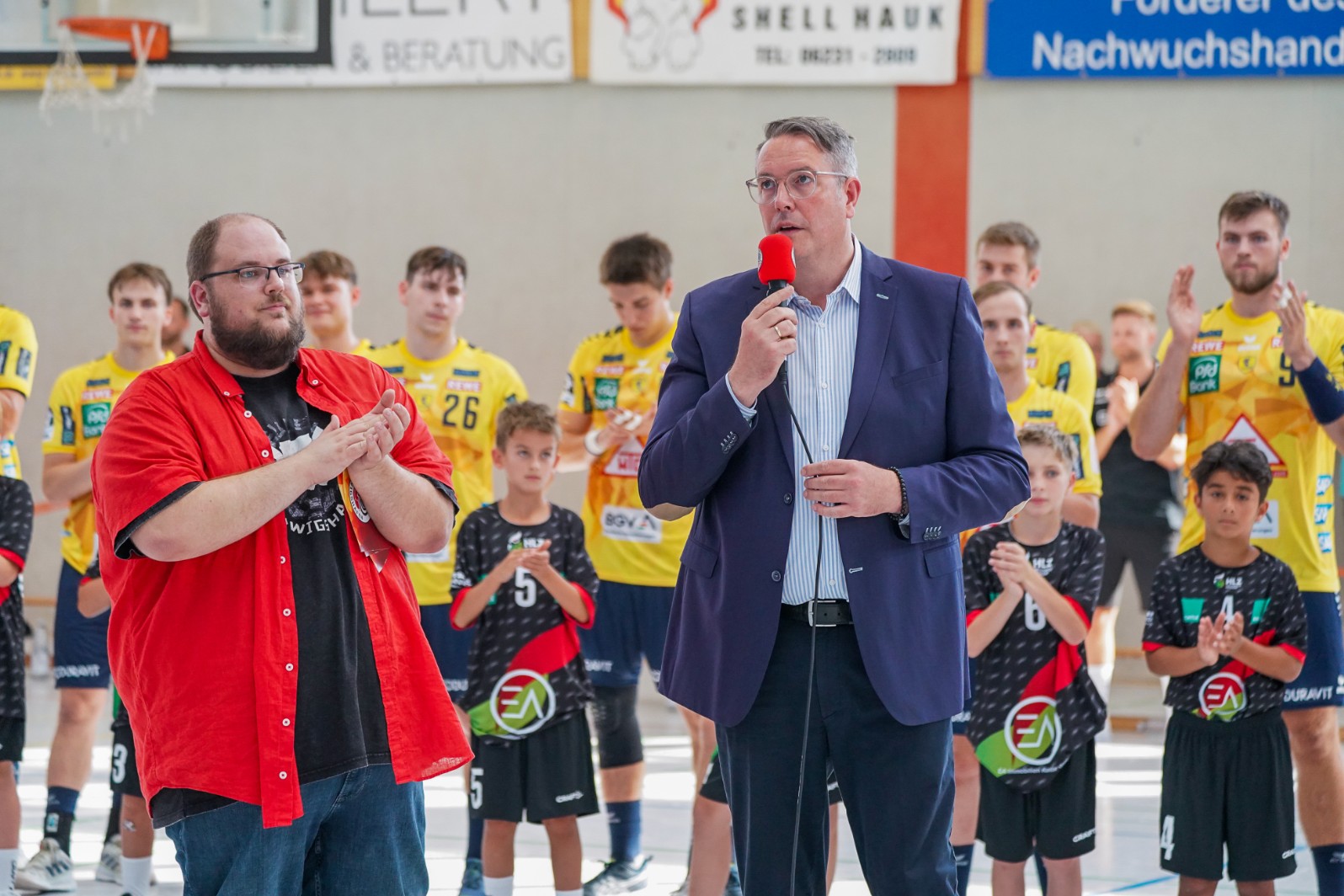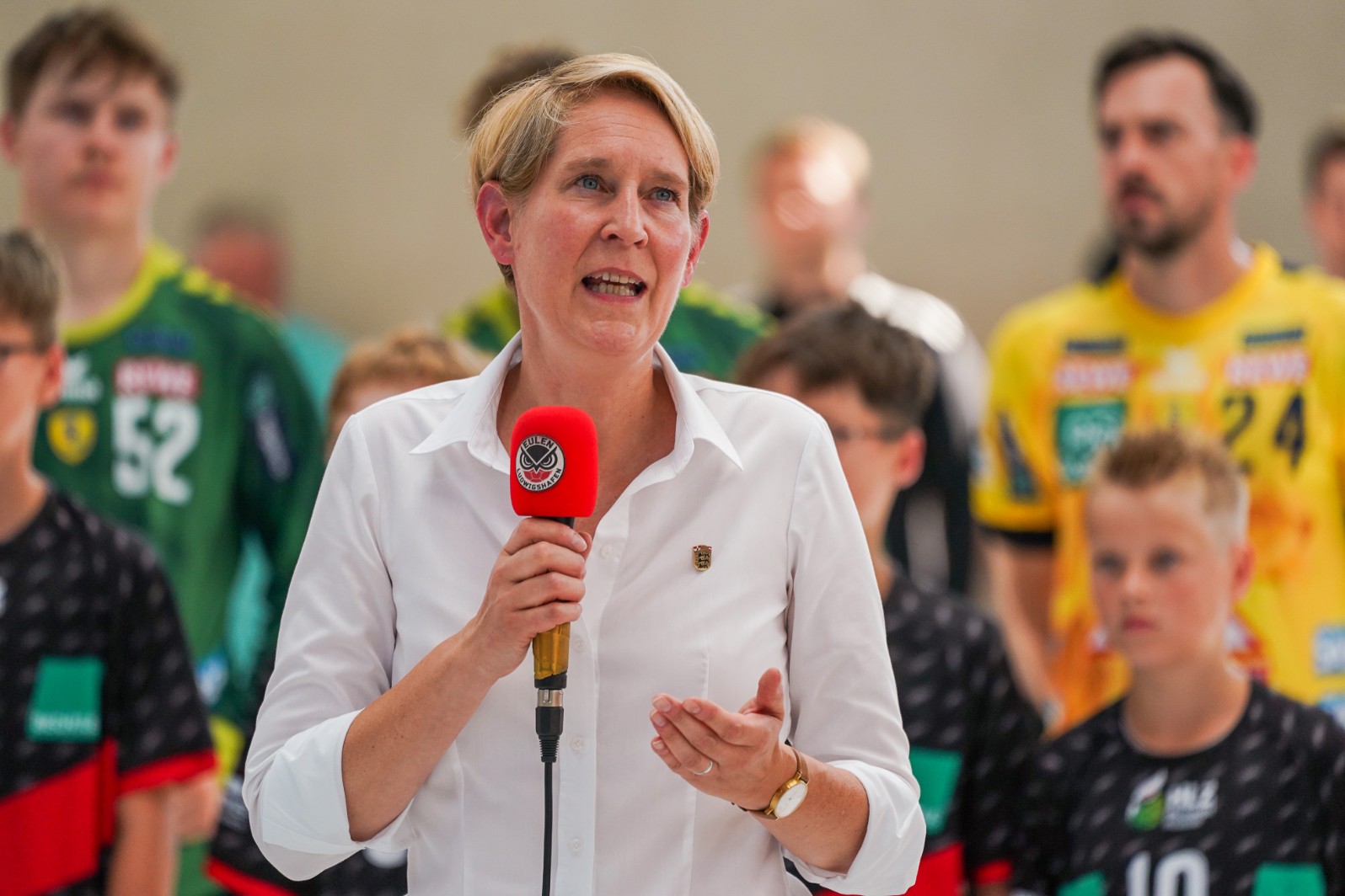 „Wir können mit den Spenden viel Gutes tun“, sagte die baden-württembergische Landespolizeipräsidentin Dr. Stefanie Hinz im Namen der Stiftung Dank für die Unterstützung durch die Handballer. „Ich bin sehr gerne gekommen“, erklärte die ehemalige Handballerin. Für die Polizeistiftung Rheinland-Pfalz bedankte sich Friedel Durben, Inspekteur der rheinland-pfälzischen Polizei im Ministerium des Inneren und für Sport. „Es ist einfach super“, rief Durben und dankte Eulen-Geschäftsführerin Lisa Heßler und der Löwen-Ikone Uwe Gensheimer, jetzt Sportlicher Leiter der Rhein-Neckar Löwen, für ihr Engagement: „Die Kollegen und Kolleginnen nehmen das als Wertschätzung wahr!“ Durben zückte verbal eine „Rote Karte gegen Gewalt gegen Polizisten und Hilfsdienste“.