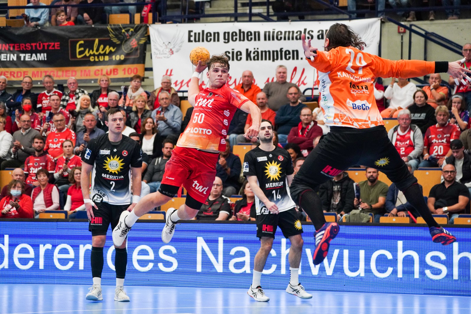 Die Niederlage am Sonntag in Lingen ist zielgerichtet aufgearbeitet worden, die Blicke der Mannschaft sind schnell auf Mittwoch gerichtet. „Ich war schon genervter nach Niederlagen“, sagte Trainer Michel Abt zur Frage nach seiner Enttäuschung ob einer wirklich unnötigen Schlappe. Gescheitert sieht der Coach die Seinen vor allem am sehr guten Torhüter Bart Ravensbergen, der 22 Paraden hatte, und der auch noch zweimal ins verwaiste Eulen-Tor traf. „Wir haben sehr, sehr gut verteidigt“, lobte Abt. Die Chancenauswertung war dieses Mal nicht gut, Max Haider sah früh Rot, „Sebi“ Trost fehlte als Torschütze und Ideengeber, sechsmal stand Aluminium im Weg, fünfmal traf der Gastgeber ins leere Eulen-Tor, drei Siebenmeter wurden vergeben. „Wenn wir bei 22:20 den Siebenmeter nutzen …“, erinnerte Abt nach dem Montagstraining an den Moment, der bei doppelter Überzahl die späte Wende hätte bringen können. Mit Lion Zacharias steht am Mittwoch auch wieder ein weiterer guter Siebenmeterschütze zur Verfügung.