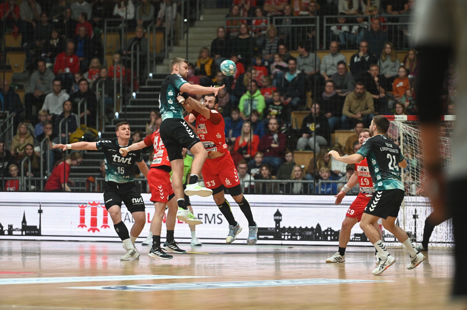 Keine gute Chancenauswertung der Eulen, zwei vergebene Siebenmeter von Tim Schaller und eine Galapartie von Bart Ravensbergen, der in den ersten 30 Minuten elf Paraden hatte – das sind die Gründe für die 12:11-Pausenführung der HSG Nordhorn-Lingen. So kam Jannek Klein schlecht ins Spiel, erst in der 15. Minute im vierten Anlauf zu seinem ersten Treffer. Da führten die Ludwigshafener 4:3. Kontraproduktiv für ihr Spiel, dass Max Haider in der 20. Minute seine zweite Zeitstrafe, mehr als umstritten, quittierte. Gleich viermal scheiterte der Gast vor der Pause am Aluminium. So auch Pascal Bührer in der 21. Minute, im Gegenstoß traf Jaime Fernandez zum 8:7. Dreimal hatte die HSG zwei Tore vorgelegt: 9:7 (21.), 10:8 (23.) und 12:10 (28.). Die Eulen blieben im Geschäft, weil Matej Ašanin zehn Parade hatte, und Enes Keskic verkürzte. Zur Pause führte Nordhorn 12:11. Krass, dass Sergej Gorpishin und Klein in der 24. Minute mit ihrer Doppelchance an Ravensbergen scheiterten.