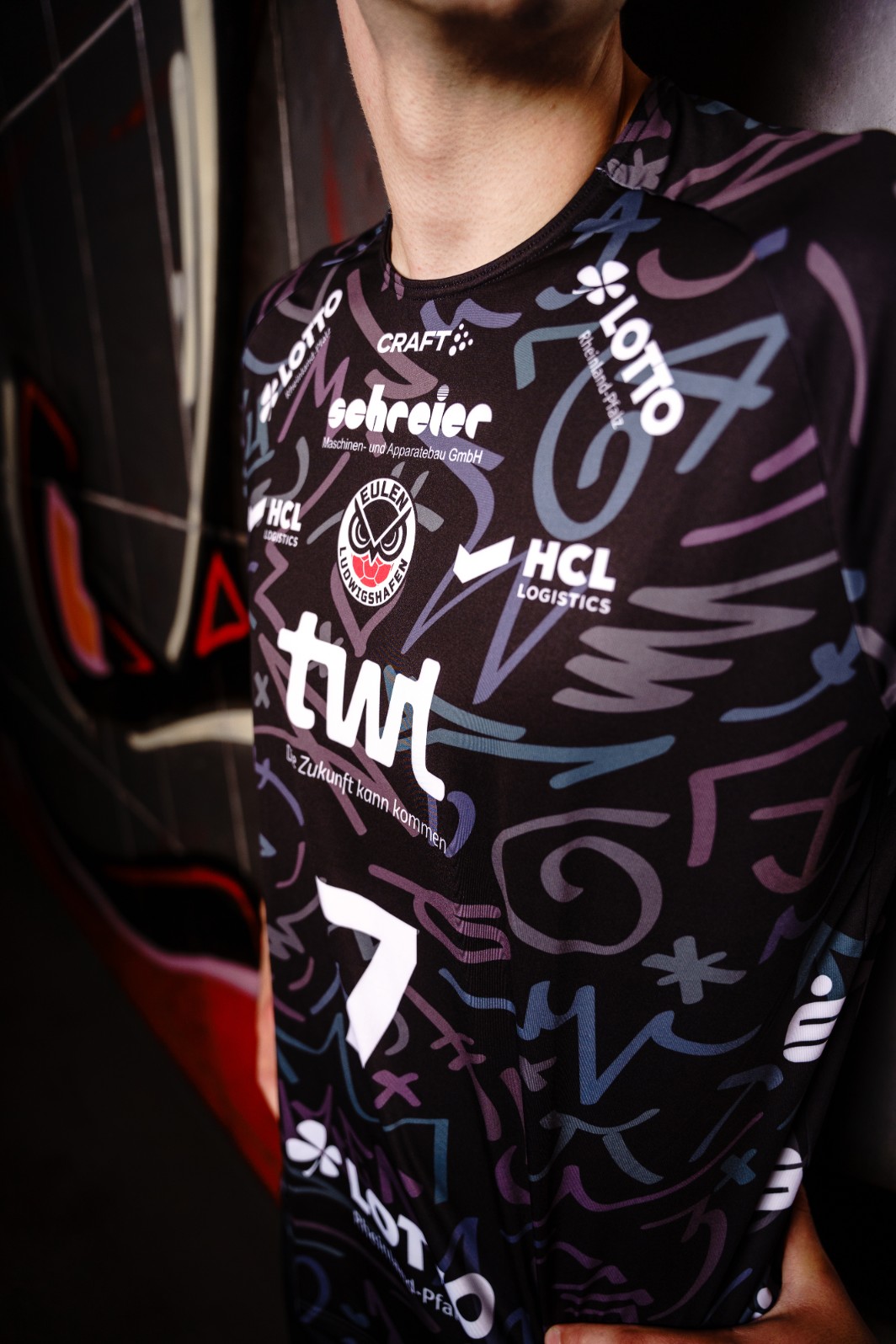 Eulen. TSG. Das Dach der Eberthalle. Augen und Flügel unseres Logos: all diese Symbole und mehr zieren in Graffiti-Style unser Trikot für die neue Saison 24/25.