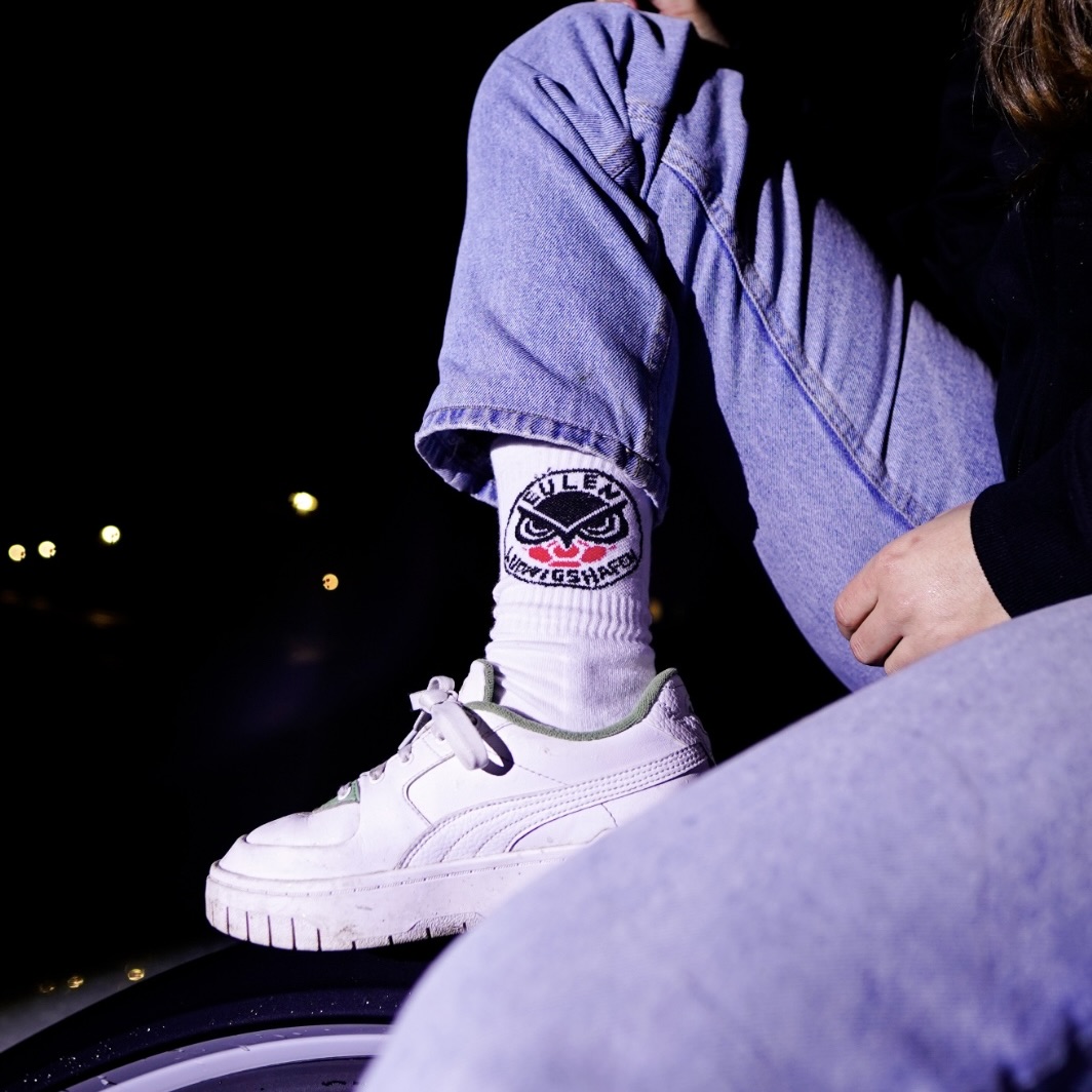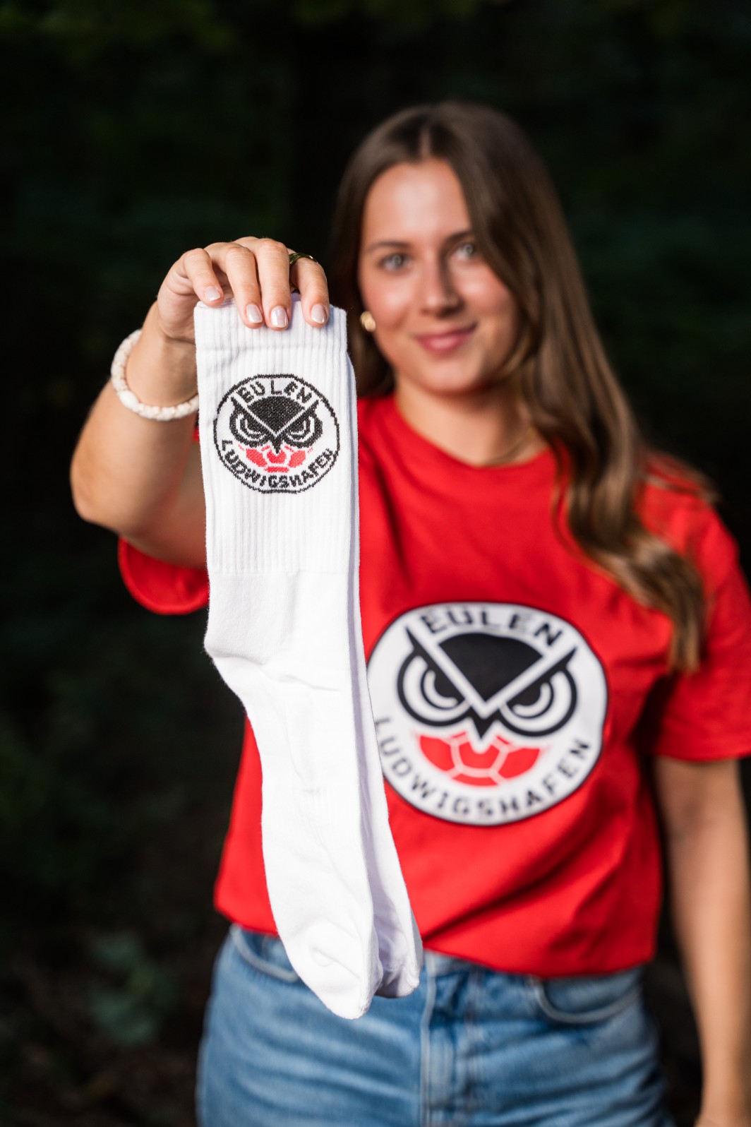 Zeige deine Unterstützung für die Eulen Ludwigshafen mit unseren stylischen weißen Socken!
